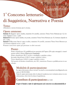 Si tratta di un’iniziativa aperta alle sole donne e c’è tempo fino al 30 maggio – con una quota di 15 euro – per partecipare, presentando un saggio, una poesia o un racconto breve.