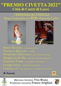 Torna anche quest’anno la serata del Premio Civetta, l’atteso evento che porta grandi nomi e grandi temi sul palco di Castri di Lecce. La manifestazione è prevista per sabato 3 settembre, presso in Piazza dei Caduti, alle ore 20.30.