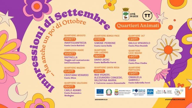 Parte questa sera, venerdì 29 settembre la rassegna “Impressioni di Settembre … ma anche un po’ di Ottobre”, organizzata dal Comune di Lecce, con il sostegno della Regione Puglia (operazione finanziata a valere su Por Puglia Fesr-Fse 2014/2020 – Asse VI Azione 6.8 – “Palinsesto PP-Tpp Puglia. Riscopri la meraviglia 2023”).