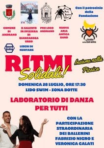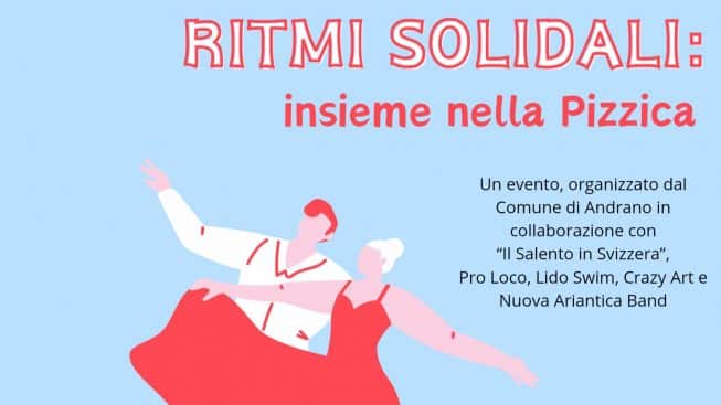 Il Comune di Andrano, in collaborazione con “Il Salento in Svizzera”, Pro Loco, Lido Swim, Crazy Art e Nuova Ariantica, organizza l’evento Ritmi Solidali, Insieme nella Pizzica, un’occasione unica per immergersi nella magica atmosfera della danza popolare salentina in un contesto inclusivo e festoso.