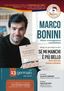 Marco Bonini incontrerà gli studenti del Liceo Scientifico Statale “Leonardo Da Vinci” di Maglie il 13 gennaio alle ore 10.00. Introdurrà l’incontro la Dirigente Annarita Corrado, dialogherà con l’autore Valeria De Vitis de Il Gabinetto Letterario.