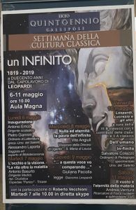 Dal 6 all’11 maggio il liceo ospiterà una serie di interventi a tema “Un Infinito” che copriranno trasversalmente diverse discipline, dalla letteratura alla medicina, dalla scienza alla religione. “Un infinito” perché ognuno di noi ha una personale idea di infinito, allo stesso tempo terrificante e rassicurante, perché è “indefinito”, allora spaventa perché non lo si conosce, ma è anche “senza fine”, quindi ci fa pensare che ci sarà sempre.