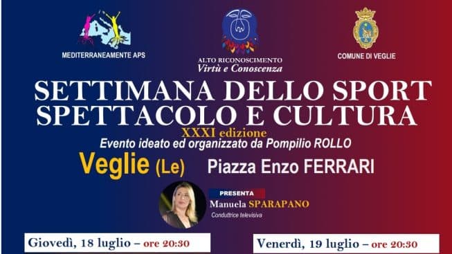 Dal 18 al 20 luglio, Piazza Enzo Ferrari a Veglie si illuminerà di emozioni, risate e puro divertimento con la XXXI edizione della Settimana dello Sport, Spettacolo e Cultura. Un evento imperdibile ideato da Pompilio Rollo, in collaborazione con MediterraneaMente APS e con il patrocinio del Comune di Veglie, che per ben trentun anni ha saputo conquistare il cuore del Salento.