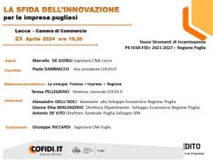 Organizzato da CNA Lecce e COFIDI.IT, l’evento si propone di analizzare e discutere i nuovi strumenti di incentivazione economica offerti dal PR FESR FSE 2021-2027 della Regione Puglia.