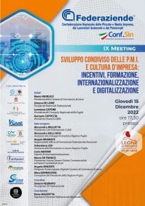 Incentivi, formazione, internazionalizzazione e digitalizzazione delle aziende, cultura di impresa e sviluppo condiviso. Saranno questi temi di strategica e stringente attualità al centro dell’edizione numero 9 del Meeting Annuale di Federaziende, la Confederazione Nazionale delle Piccole e Medie Imprese, dei Lavoratori Autonomi e dei Pensionati. L’evento si svolgerà giovedì 15 Dicembre, alle ore 17.30 presso l’Hotel & Conference Leone di Messapia. Si tratta di una kermesse molto attesa non solo dagli addetti ai lavori ma anche da tutto il sistema produttivo salentino che coglie l’occasione per tirare un bilancio del tempo trascorso e stilare nuovi progetti per il futuro.