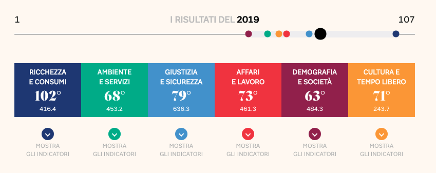 Sono passati 30 anni da quando il Sole 24 ore ha cominciato ad ‘analizzare’ la qualità della vita, raccontando le province italiane dove si vive meglio. E per festeggiare questo traguardo ha deciso di pensare in grande per stilare la classifica finale del 2019, cercando di includere quegli aspetti che, quotidianamente, incidono sul benessere della popolazione. L’obiettivo è riuscire a fotografare al meglio la complessità di un territorio. Restano le sei macro-categorie tematiche che accompagnano l’indagine dal 1990: “Ricchezza e consumi”, “Affari e lavoro”, “Ambiente e servizi”, “Demografia e società”, “Giustizia e sicurezza”, “Cultura e tempo libero”, ma gli ‘indicatori’ considerati per elaborare le 107 posizioni sono saliti da 42 a 90. Per la prima volta, ad esempio, è stato elaborato un Indice del clima. Tra i nuovi reati monitorati nell’indice di criminalità sono state incluse le violenze sessuali e le estorsioni denunciate dalla popolazione.