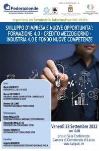 Formare e sostenere le aziende del Salento nel processo di trasformazione tecnologica e digitale con il fine ultimo di aiutarle ad essere sempre più competitive in un mercato sempre più globale. Nasce con questi intenti il Seminario Informativo organizzato da Federaziende dal titolo: ‘Sviluppo d’Impresa e Nuove Opportunità: Formazione 4.0 – Credito Mezzogiorno – Industria 4.0 e Fondo Nuove Competenze’.