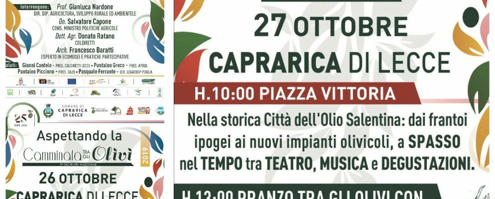 Anche quest’anno torna una nuova edizione della Camminata tra gli Olivi a Caprarica di Lecce. Domenica 27 ottobre in 123 Comuni d’Italia aderenti all’Associazione Città dell’Olio e il Salento non poteva certo mancare. La Camminata tra gli Olivi è un ritorno alla propria terra, un modo per far conoscere il paesaggio di una grande civiltà millenaria e per far scoprire ai tanti appassionati della cultura enogastronomica del nostro paese i territori di origine del prodotto attraverso gli alberi di olivo e gli uomini che lo custodiscono.
