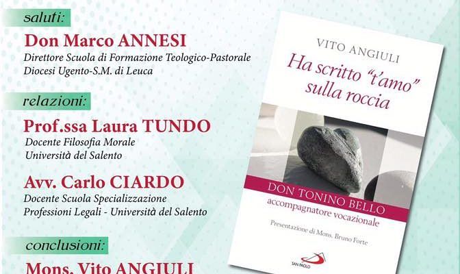L’appuntamento, che ha come sottotitolo “Il pensiero di Don Tonino Bello educatore vocazionale”, prende le mosse dalla pubblicazione del volume “Ha scritto “t’amo” sulla roccia” scritto dal Vescovo di Ugento – S.M. di Leuca, Mons. Vito Angiuli.