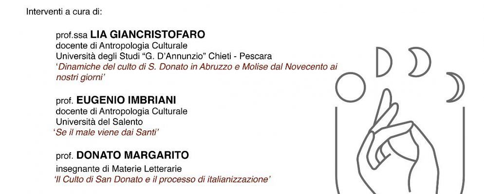 Il Convegno di studi intende porre l’accento sul culto di San Donato come patrimonio dell’intera comunità, studiarne le dinamiche per riconoscere le proprie radici e fare della tradizione un elemento distintivo e “strumento” di valorizzazione del territorio. Punto di partenza è il culto di San Donato e il rito ad esso connesso, inteso come mezzo per superare il “male” e raggiungere un equilibrio personale e di comunità. Fede, devozione, partecipazione, magia, terra, salvezza, diventano elementi dello stesso racconto, espressioni dell’inconscio collettivo teso verso la catarsi comunitaria.