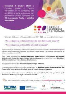 Mercoledì 9 ottobre 2024, a Corsano, presso il “Centro Polivalente” di via Campania, alle ore 18.30, si terrà un incontro per presentare l’offerta formativa dell’ ITS Aerospazio Puglia – Mobilità Sostenibile.