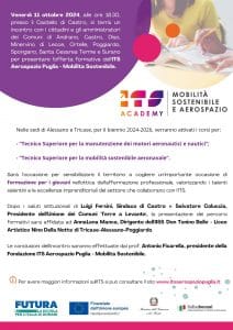 Il Salento è pronto a spiccare il volo! L’Its Aerospazio Puglia – Mobilità Sostenibile invita il territorio a partecipare a due incontri informativi A Corsano il 9 ottobre, ore 18.30 e a Castro l’11 ottobre, ore 18.30. Si tratta di due eventi finalizzati a fare scoprire da vicino le opportunità formative che offrono tutti i nuovi corsi Its che a breve partiranno in Puglia in un settore strategico per l’economia del territorio e in maniera particolare i due corsi biennali che avranno sede ad Alessano e Tricase: