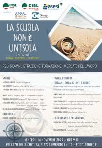 La Cisl di Lecce, in collaborazione con Cisl Scuola Lecce e Asesi, e grazie alla partnership strategica con Arpal Puglia e l’Agenzia per il Lavoro GiGROUP S.p.A., annuncia l’evento di presentazione della seconda edizione del percorso di Formazione Scuola Lavoro (FSL) “La scuola non è un’isola”.