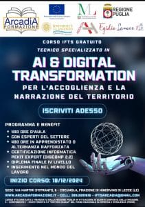 Il Salento si conferma all’avanguardia nell’innovazione. Grazie ad una partnership tra Arcadia Formazione, l’Università del Salento e numerosi altri enti, prende il via un nuovo corso gratuito IFTS (Istruzione e Formazione Tecnica Superiore) dal titolo “AI & Digital Transformation per l’Accoglienza e la Narrazione del Territorio“.