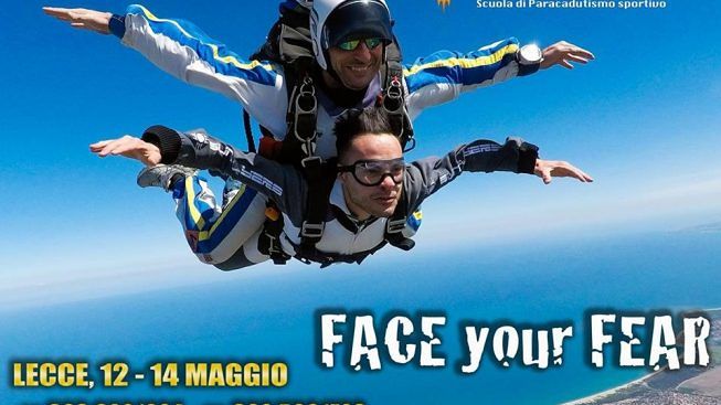 “Face your fear”, affronta la tua paura. Guardala in faccia e lanciati, nel vero senso della parola. Lo slogan dell’evento già lascia intendere il senso dell’attività che Sunflyers, Associazione sportiva che promuove il paracadutismo in Puglia, proporrà dal 12 al 14 maggio in località Fondone (Lecce, SP298, Km 4 oppure tangenziale Est di Lecce, uscita 8B, 2km circa a sinistra). Nei pressi dell’aviosuperficie, dunque, spazio a chi vuole misurarsi con sé stesso, provando cosa significhi saltare da un aereo a quattromila metri d’altezza e “volare”. Ebbene sì, la sensazione corrisponde proprio a quella – per circa un minuto – di librarsi in volo e dominare il panorama da una prospettiva diversa. O comunque non vivibile tutti i giorni, questo è poco ma sicuro. Pertanto, dopo l’evento inaugurale avvenuto gli scorsi 4 e 5 marzo (oltre ad un altro appuntamento che ha registrato un vero e proprio boom di prenotazioni nella date 17-18 marzo), finalmente nel secondo fine settimana di maggio riprendono i lanci in tandem. Adrenalina e divertimento alla stato puro per una giornata che, statene certi, si prospetta indimenticabile. Tutto qui? Niente affatto. Poco dopo l’atterraggio col paracadute, un operatore dell’associazione realizzerà il video dell’esperienza vissuta a mezz’aria, permettendo così di possederne il ricordo.