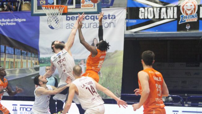 In avvio di terzo periodo è Nardò la prima a centrare la retina, ma Henderson risponde con un’altra schiacciata. Gli ospiti non demordono e con 6 punti consecutivi si portano sul -7. La Next continua a lottare, mentre i padroni di casa sono sfortunati su alcune conclusioni. Fallucca subisce fallo sul tiro da 3 punti e concretizza tutti i liberi. La Benacquista gioca di squadra e merita gli applausi del PalaBianchini anche sulla tripla di Radonjic. Il Toro rimane comunque in scia mettendo a segno un break di 10-0 che manda in archivio il terzo quarto sul 65-64. La quarta frazione si apre con due triple consecutive di Radonjic ma Nardò riduce il divario dall’arco. Si segna esclusivamente da 3 punti, La Torre e Ferguson per Nardò, Mouaha per Latina. Una gara incredibile, nuovamente Nardò dalla lunga distanza per il -1, replica Veronesi con un bellissimo gioco da 3 punti. Thomas riduce con due liberi, ma Radonjic non perdona dall’arco con la sua settima tripla. A 2’ dal termine Ferguson realizza la tripla della parità. Si lotta sotto le plance e Nardò riesce a centrare la retina del sorpasso a 33″. Dopo il time-out Latina, una tripla da distanza siderale di Veronesi che concretizza anche due liberi. C’è meno di un secondo sul cronometro quando Poletti firma la tripla del 93-93 e si va all’overtime.