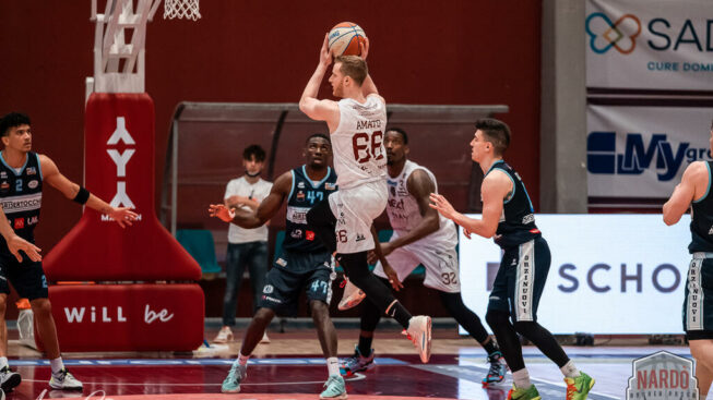 L’accoppiata Raivio-Morse prova a suonare la carica ma i meccanismi offensivi si inceppano ben presto, permettendo ad Amato di iniziare il suo personale show: tre bombe e diversi assist per i suoi compagni che propiziano il 33-52 con cui Nardò si trova a comandare trascorsi 4:20 nel corso del terzo parziale. Tentativo di rimettere le mani sulla partita da parte dei biancorossi con l’inaspettata tripla di Morse, seguito subito dopo da Raivio ma Nardò è inarrestabile da fuori e dentro l’area. Nel corso dell’ultimo, e decisivo, quarto Nardò è abile a gestire i 17 punti di vantaggio accumulati nel corso dei primi 30 minuti; Piacenza trova nei soli Raivio, Morse e Chinellato i punti per provare a diminuire lo svantaggio ma la mole di gioco prodotta non è abbastanza. Nardò vince meritatamente la partita con il punteggio di 63-78, conquistando il vantaggio campo nella fase dei playout che la vedrà contrapposta a Capo d’Orlando.