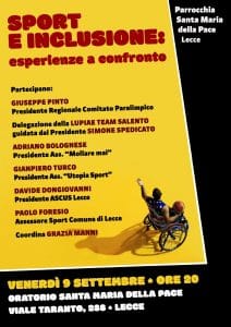 Da sempre lo sport è la miglior medicina per tutti e a testimoniarlo ancor di più un incontro dal titolo “Sport e inclusione: esperienze a confronto”, che avrà luogo venerdì 9 settembre presso l’oratorio Santa Maria della Pace a Lecce a partire dalle ore 20:00. Nel corso dell’inziativa alcuni atleti e dirigenti disabili saranno punto di riferimento regionale. Esempi di vita che a colpi di successi sportivi stanno contribuendo a migliorare – con un confronto diretto con le istituzioni locali – anche il tanto sognato modello di città accessibile a tutti.