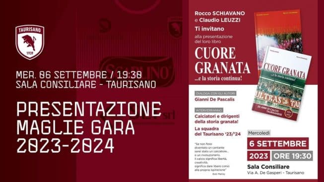 Infine, si svolgerà la presentazione del volume “Cuore granata… e la storia continua” sarà l’occasione per ripercorrere, in chiave agonistico sportiva, l’evoluzione vissuta dal calcio a Taurisano, dalla stagione 2001/2002 sino a quella 2022/2023.