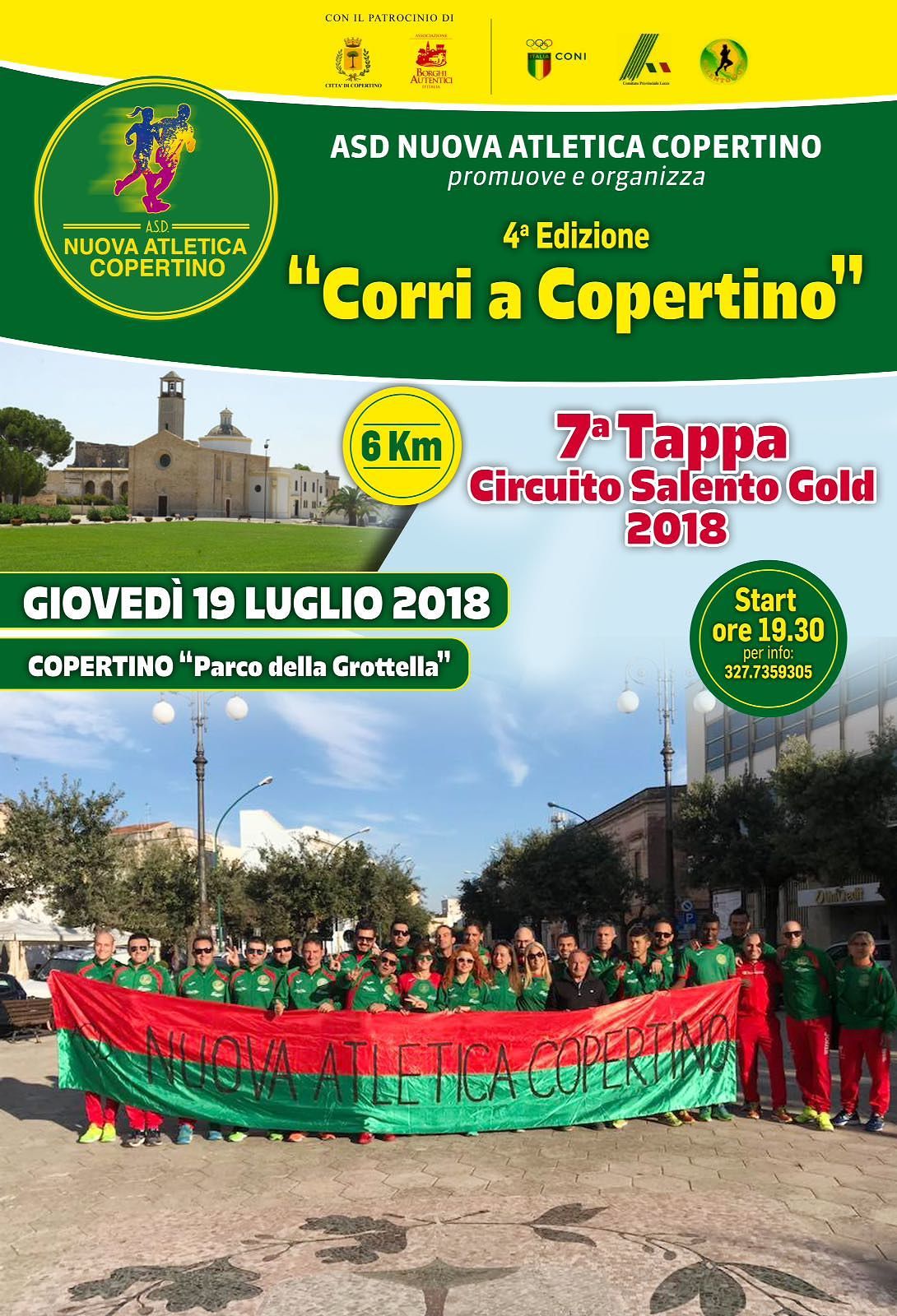 Dopo Borgagne, Ugento, Santa Maria di Leuca, Porto Selvaggio, Trepuzzi e Minervino, il circuito fa tappa a Copertino dove giovedì 19 luglio l’Associazione Sportiva Nuova Atletica Copertino, con il patrocinio del Comune di Copertino e del Comitato Provinciale del Coni, promuove la 4a edizione di “Corri a Copertino”, gara di 6 km con partenza e arrivo nella splendida cornice del Parco della Grottella.