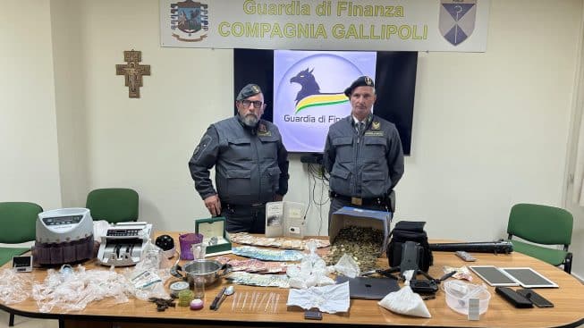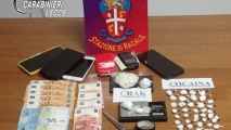 Nel corso della perquisizione, i Carabinieri della Stazione di Racale, hanno rinvenuto anche forbici, nastro isolante, un bilancino e centinaia di euro in contanti.