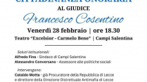 Attualità / 24 Febbraio 2025 11:45 Al Giudice Francesco Cosentino, la cittadinanza onoraria del Comune di Campi Salentina Nel corso della cerimonia, interverranno l'ex Procuratore capo di Lecce Cataldo Motta, Francesco Mandoi ed Elsa Valeria Mignone Di Redazione