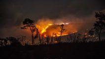 Tra la folla di bagnanti, in lontananza, si vede il fumo provocato dalle fiamme che bruciano il bosco della località. Nessun pericolo per il diving center presente nella zona.