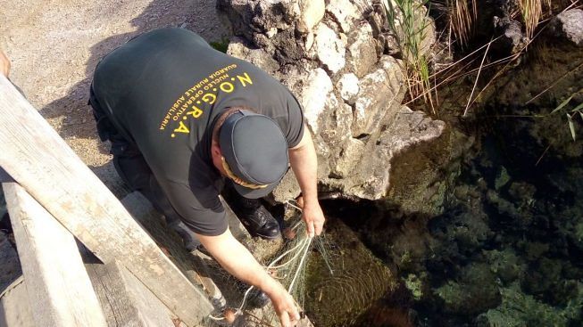 Una grossa rete da pesca apposta sotto al ponticello del bacino dell'Idume non è passata inosservata ai residenti. La segnalazione e l'intervento del NOGRA Lecce con le Guardie zoofile.