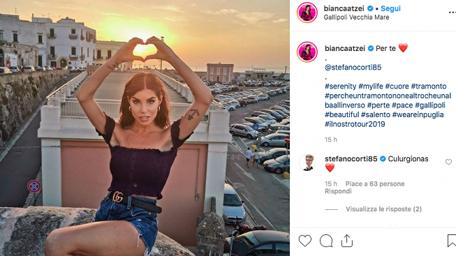E anche ieri, l’artista che ha lanciato il suo nuovo singolo «La mia bocca», scritto di suo pugno e prodotto da Antonio Marcucci, ha voluto fare una dedica d’amore speciale al suo compagno: un cuore con le mani. Sullo sfondo, una bellissima Gallipoli vecchia al tramonto, dove si trova per partecipare alla finale di Miss Mondo Italia.