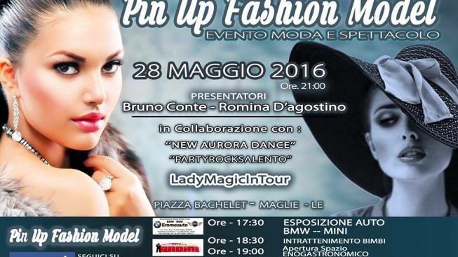 Un multiforme evento di moda e intrattenimento giunto ormai alla sua terza edizione. Parliamo di Pin Up Fashion Model, una bellissima manifestazione che si terrà a Maglie in Piazza Bachelet, il 28 maggio 2016, a partire dalle ore 17.00. L'area dell'evento – recentemente ristrutturata – peraltro sarà abbellita dalle installazioni luminose di Massimo Mariano Luminarie, eccellenza salentina nel mondo che colleziona premi e riconoscimenti nelle maggiori città europee. L'evento comincerà alle ore 17.00 con un'esposizione di automobili della concessionaria Emmeauto BMW & Mini di Maglie e attraverso la dimostrazione TV curata dallo staff di Sky TV di De Iaco Maglie.