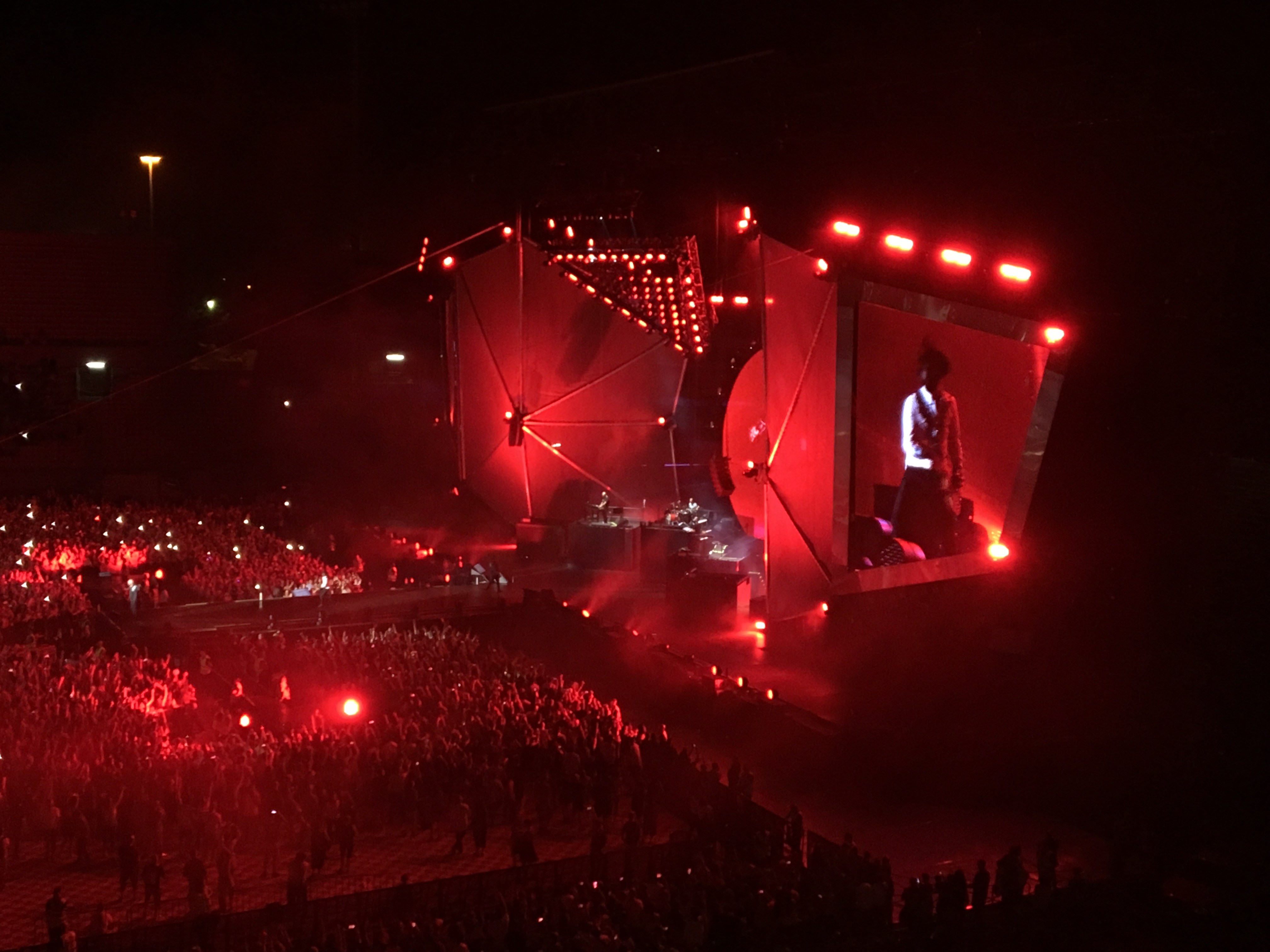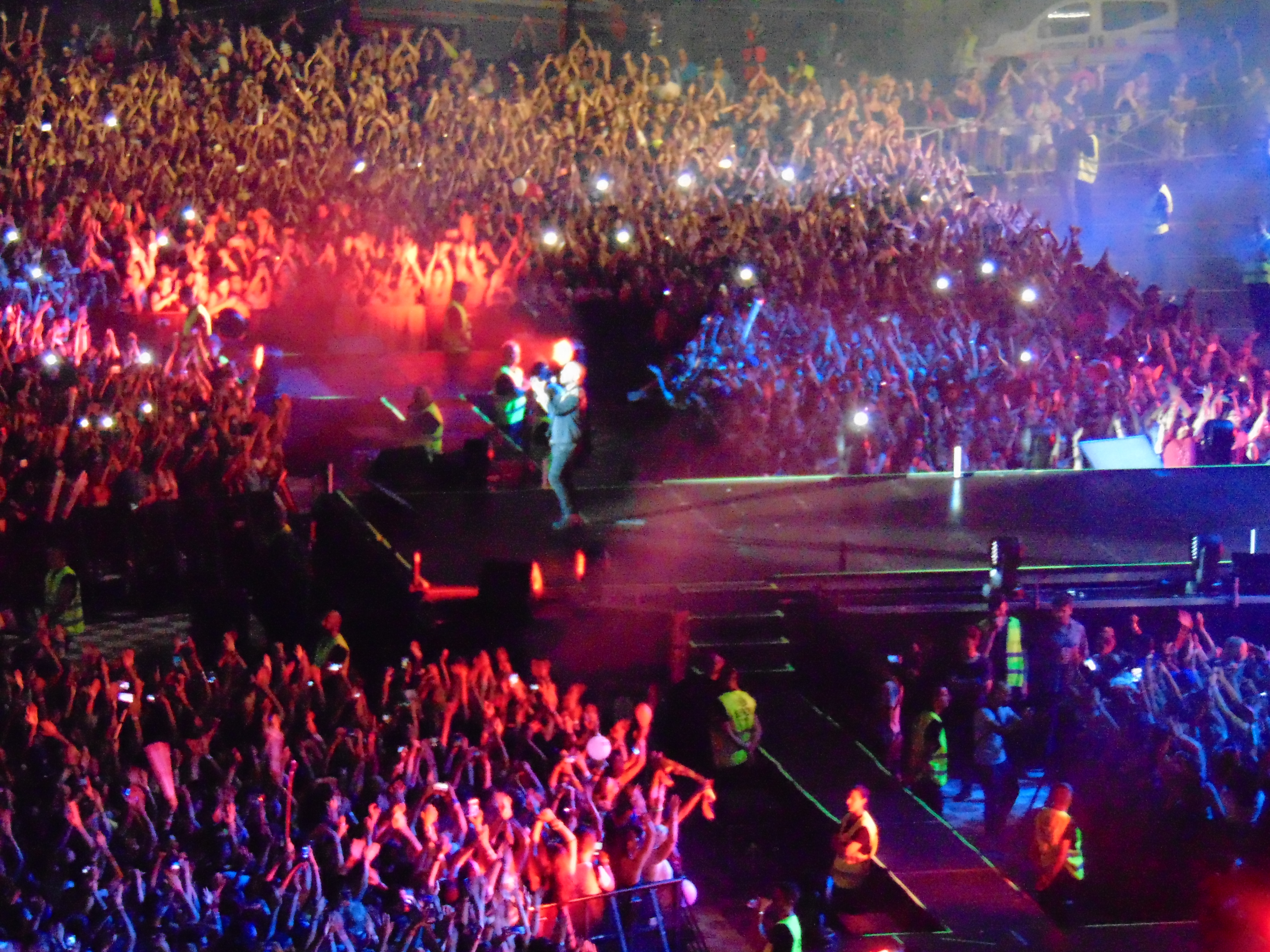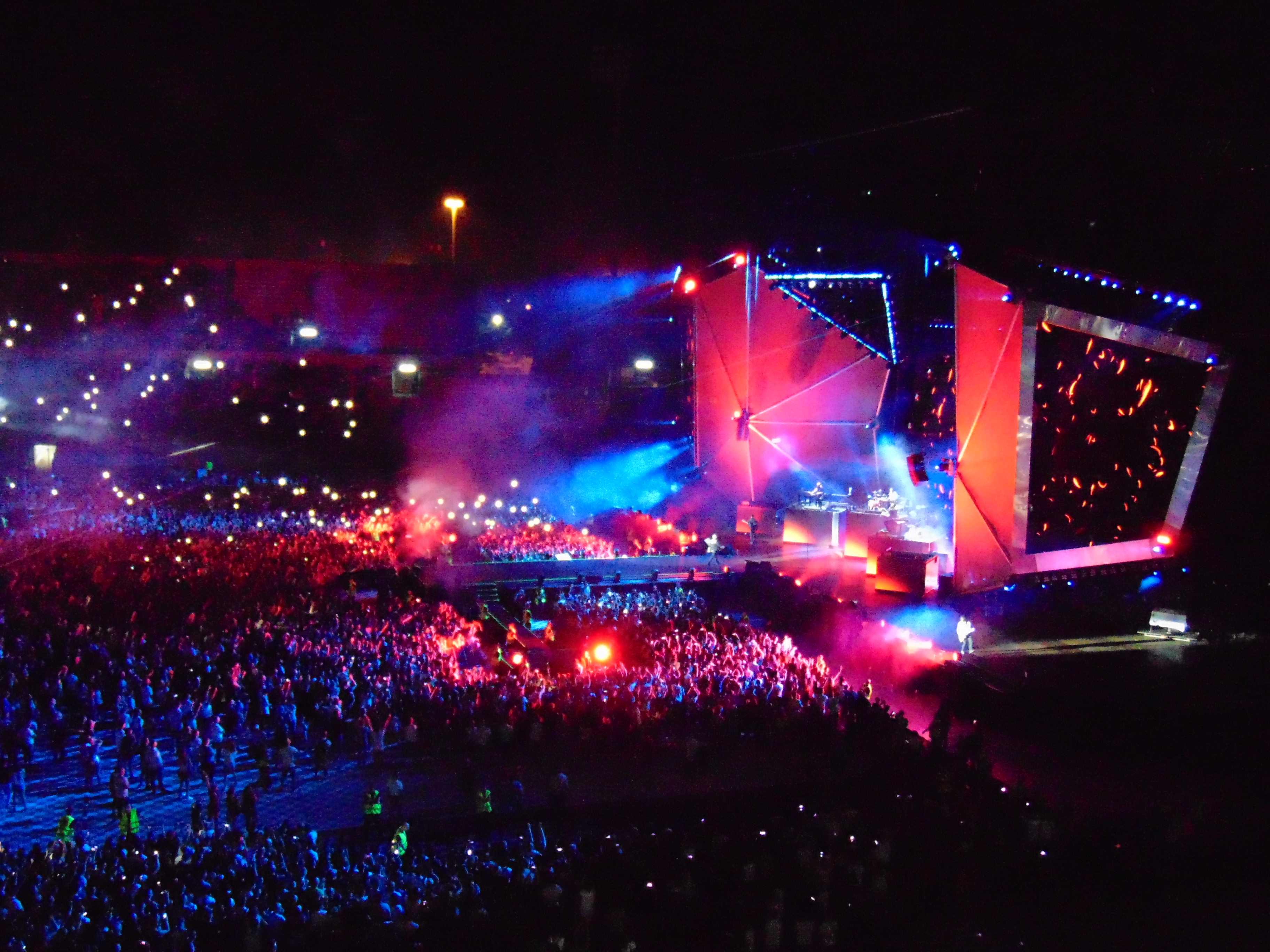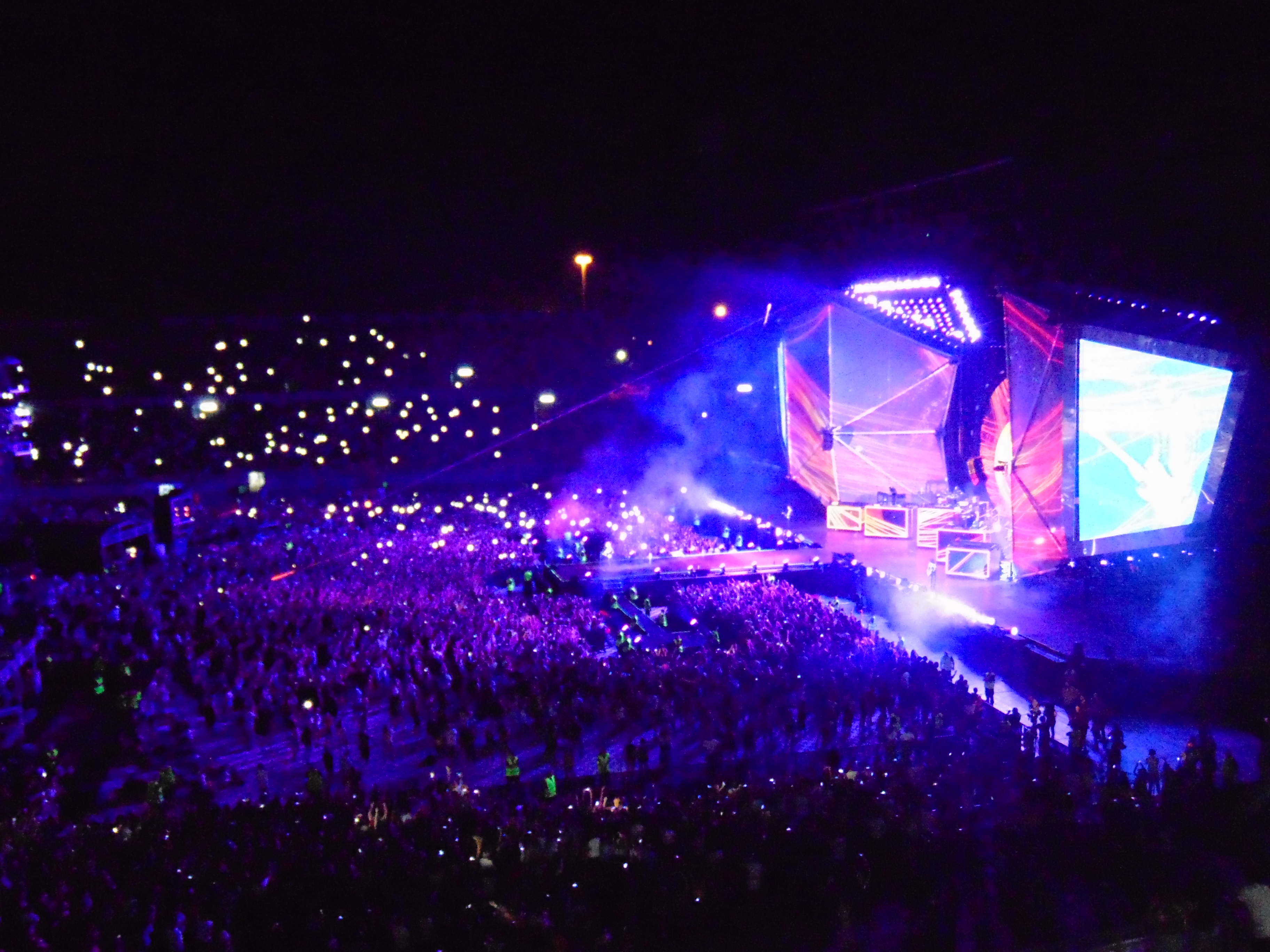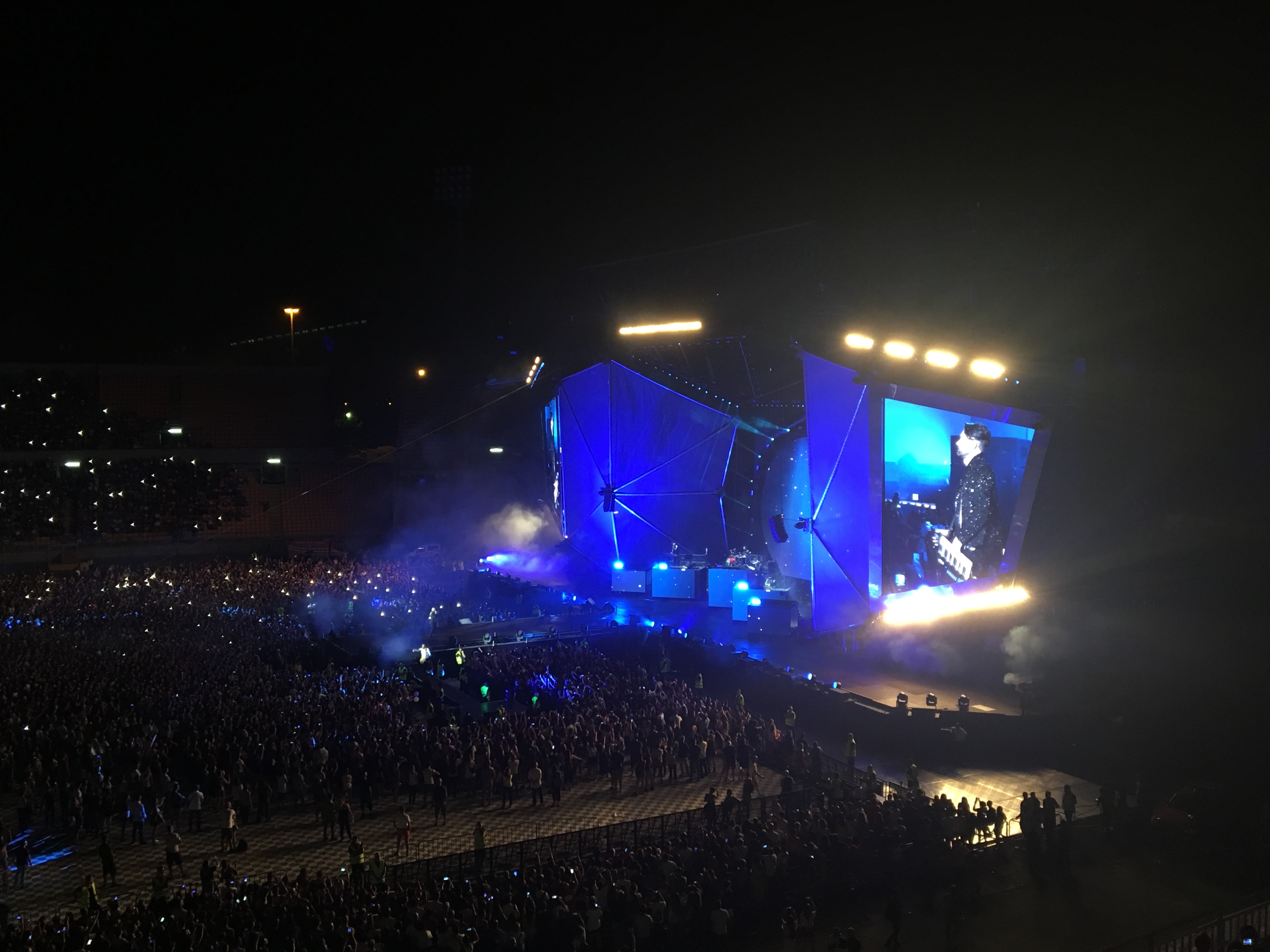 La giornata è iniziata molto presto: già dalla mattina i primi gruppi di fan si sono assiepati davanti ai cancelli, aperti intorno alle ore 17. Corse sotto il palco, magari alla ricerca di un po’ di ombra, mentre anche gli spalti andavano riempiendosi in men che non si dica. Alle 21.30 si spengono le luci e si illumina il palco: i 13 maxi schermi che compongono la scenografia si accendono e dopo un lungo video che suona la giusta carica, parte lo spettacolo.