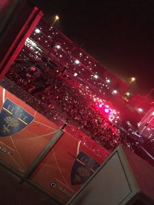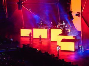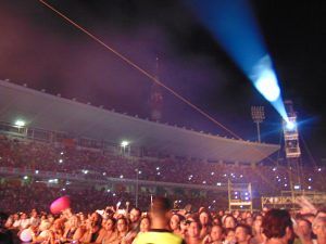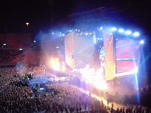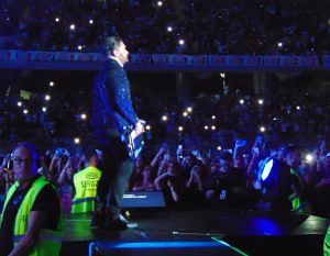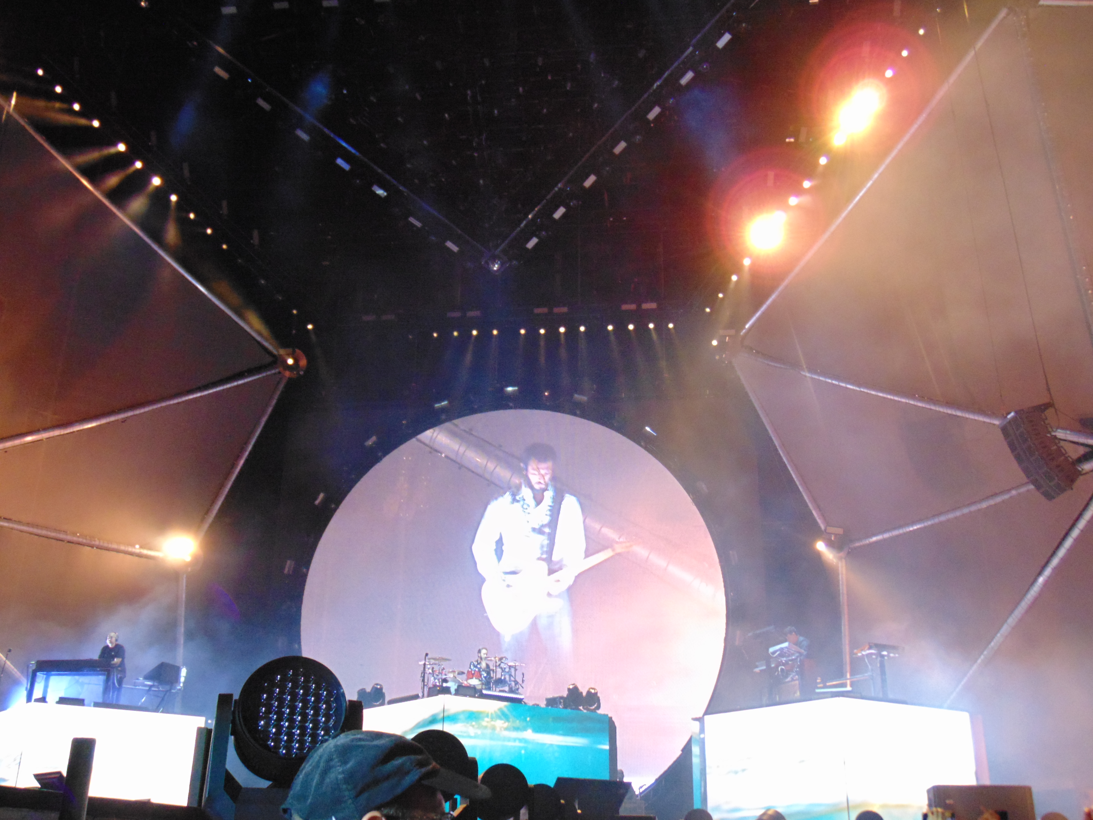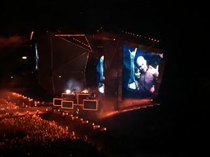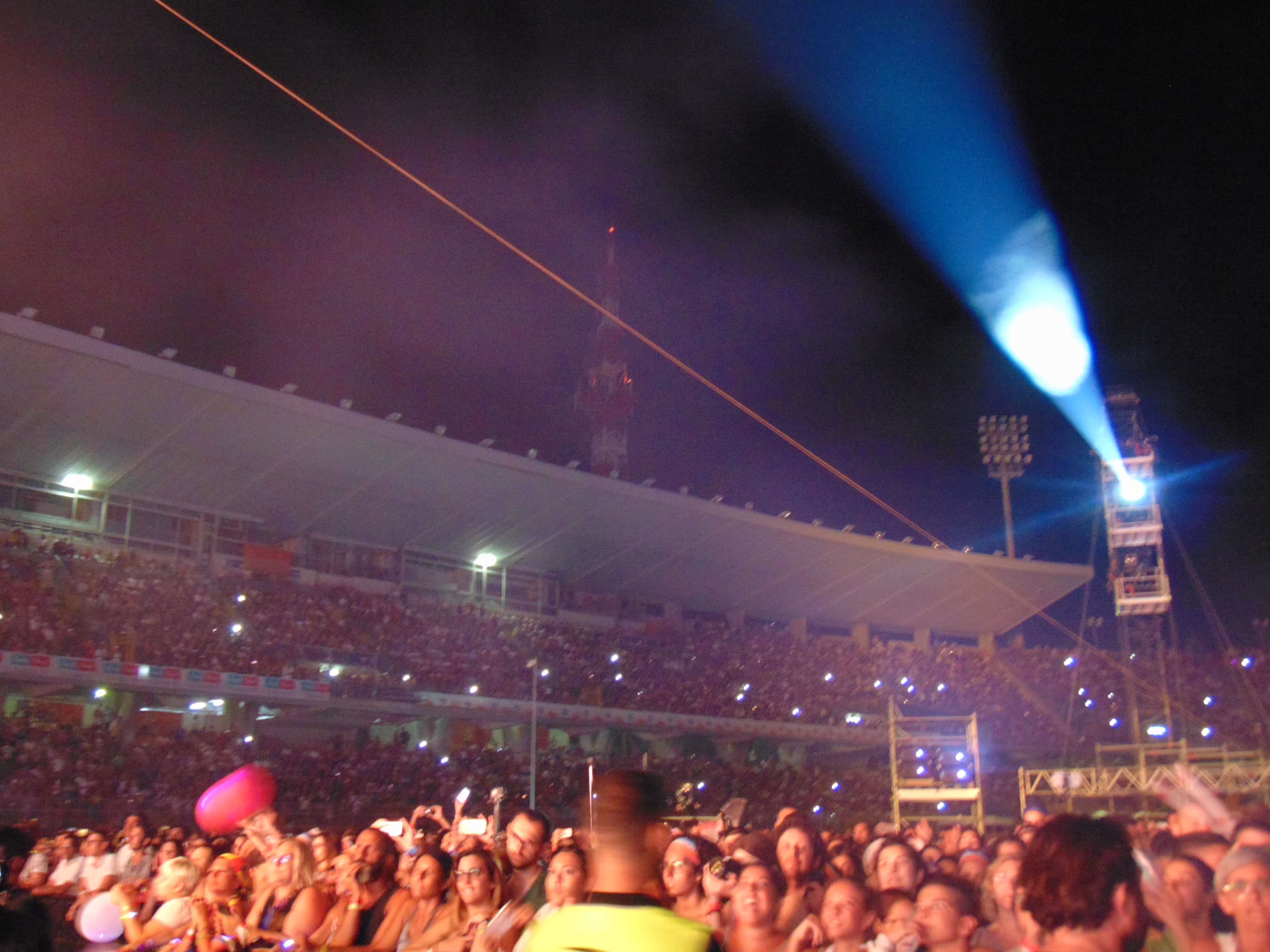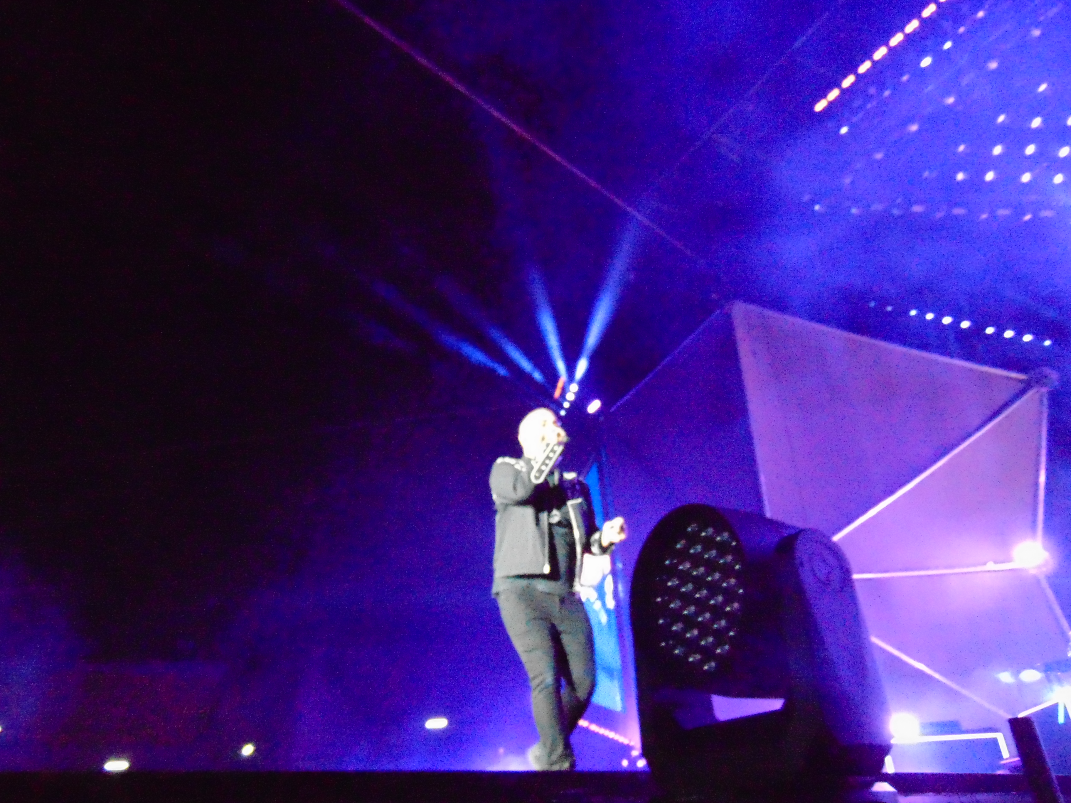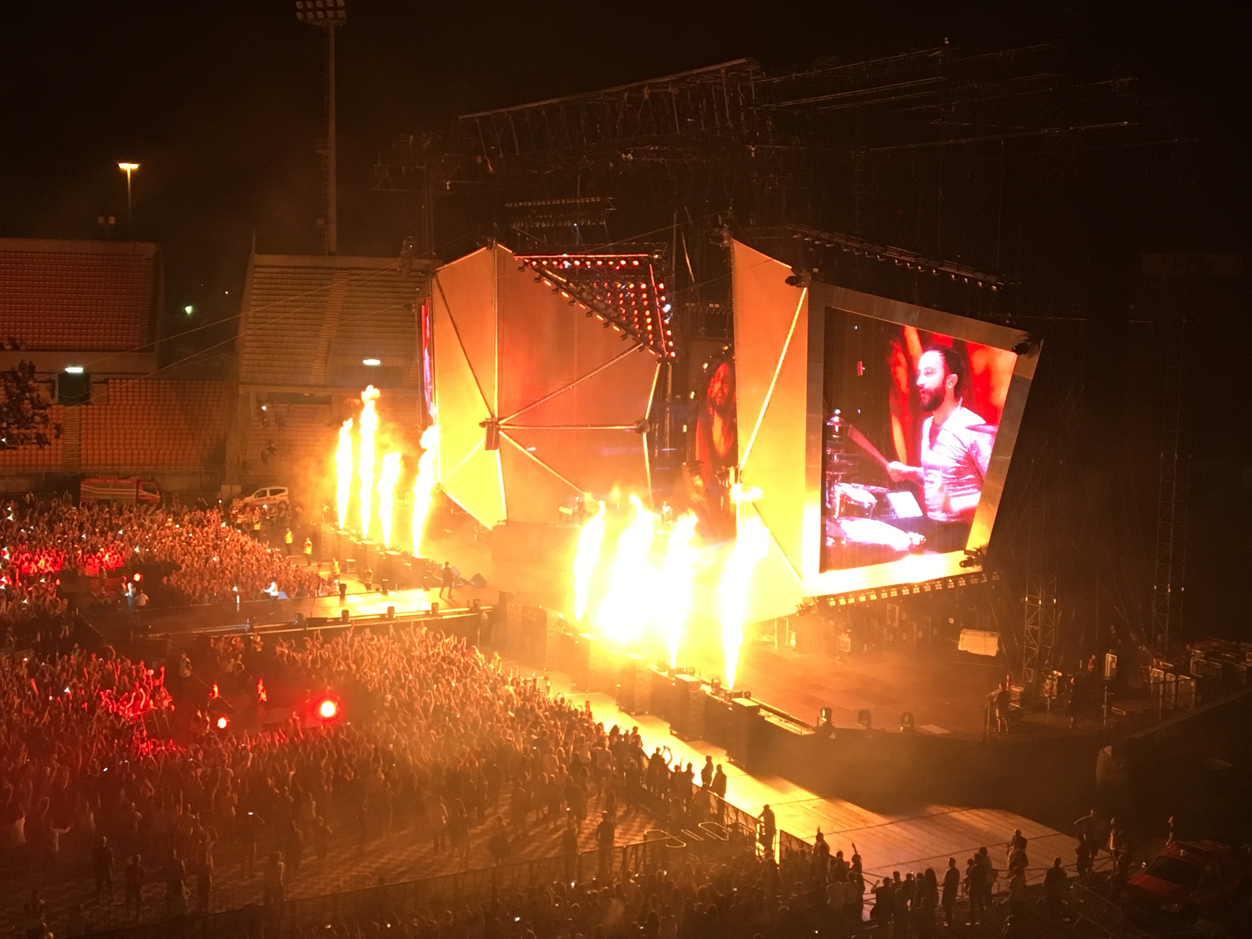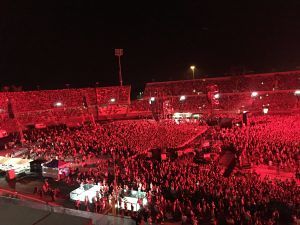 La giornata è iniziata molto presto: già dalla mattina i primi gruppi di fan si sono assiepati davanti ai cancelli, aperti intorno alle ore 17. Corse sotto il palco, magari alla ricerca di un po’ di ombra, mentre anche gli spalti andavano riempiendosi in men che non si dica. Alle 21.30 si spengono le luci e si illumina il palco: i 13 maxi schermi che compongono la scenografia si accendono e dopo un lungo video che suona la giusta carica, parte lo spettacolo.