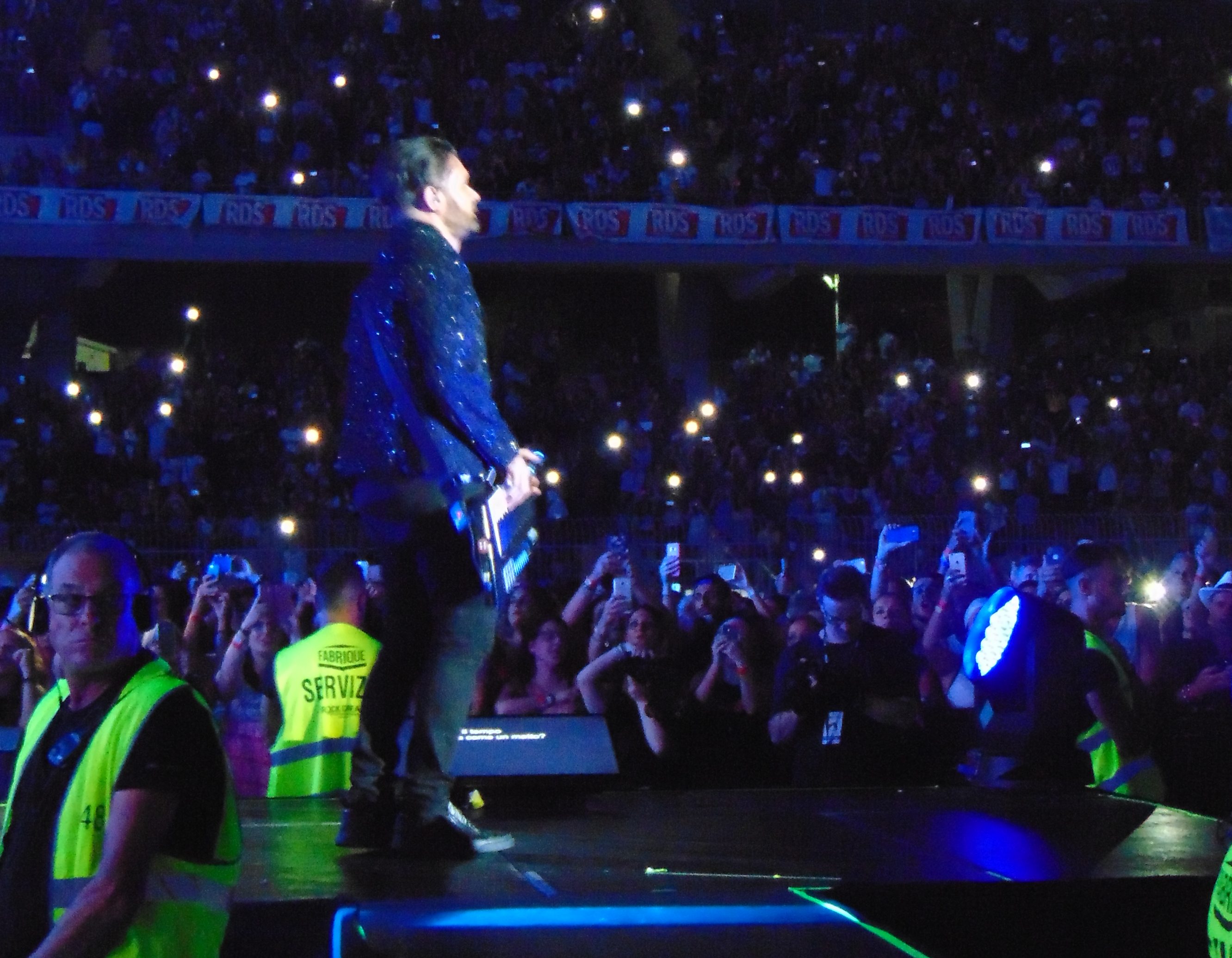 “Senza fiato”, poi, è il brano inciso con Dolores O’Riordan, che Giuliano ricorda commosso: lo stadio intero applaude.