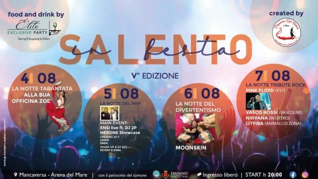 Dopo il successo riscosso con le scorse edizioni, torna a Mancaversa “Salento in Festa”, l’attesissimo evento che porta dj, gruppi musicali e artisti nelle sere d’estate salentine. Giunta alla quinta edizione, la manifestazione è patrocinata dal Comune di Taviano. Ad ospitare l’evento sarà l’Arena del Mare, nella marina di Mancaversa a 10 km da Gallipoli. L’evento è creato e organizzato da Milano Peperoncino Live Food.