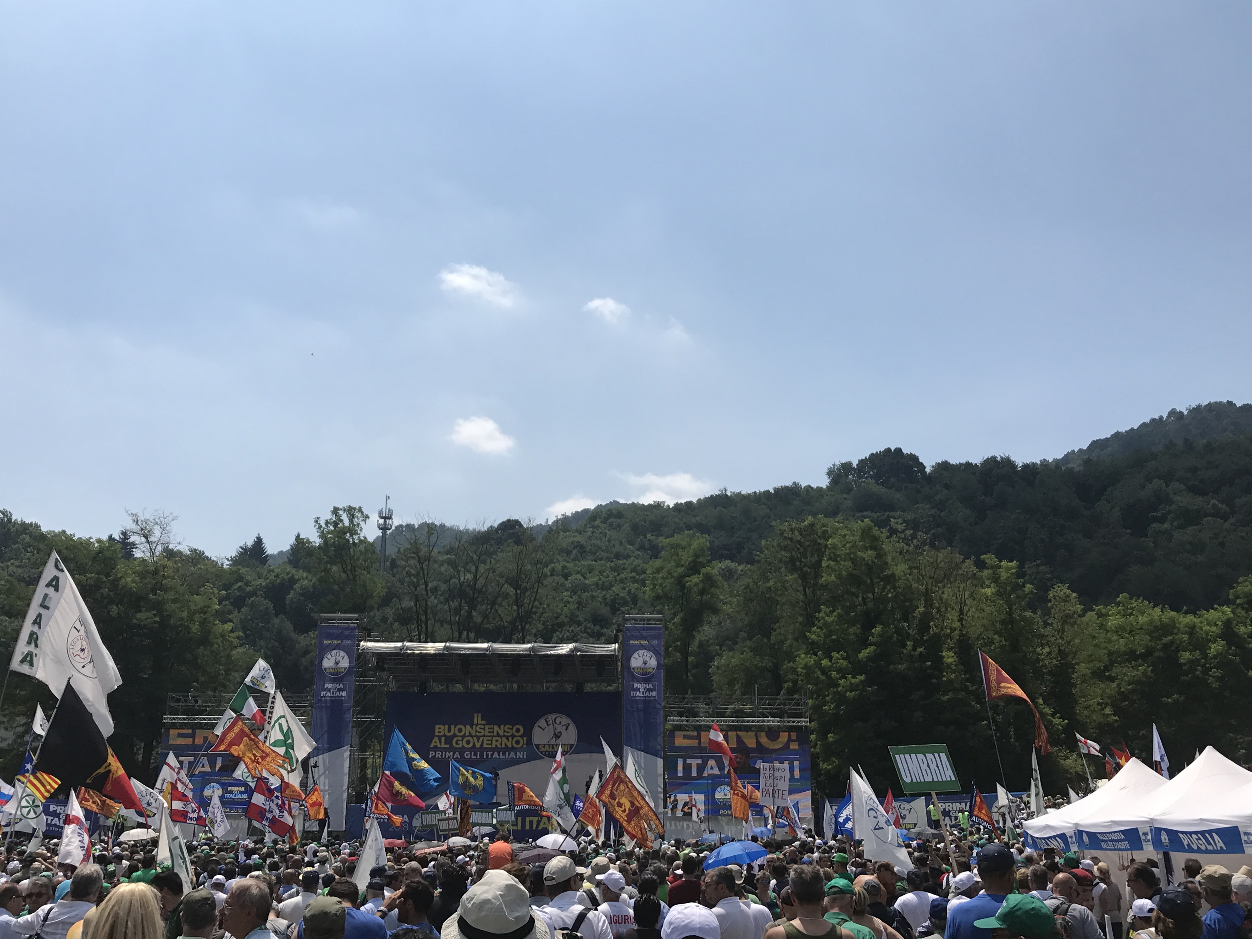 40 minuti di discorso il suo, dove tocca tutti i temi a lui più cari: immigrazione, rapporti con l’Unione Europea, sicurezza. Il capo del “Viminale” è un fiume in piena, non manca un riferimento ai campionati del mondo di calcio: “Ho visto la partita di ieri… ho sperato che accadesse qualcosa, ma non è accaduto. Non c’è più il Messi di una volta”; chiede spesso agli uomini della Croce Rossa, “l’unica ONG che ci piace” di aiutare le persone che, complice il caldo, sono preda di malori e annuncia: “Governeremo 30 anni, sono al lavoro per creare una super Lega europea che faccia sentire, ancora più forte, la sua voce”.
