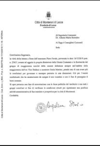 La sindaca di Monteroni Angelina Storino, a pochi giorni dal Consiglio comunale in cui la maggioranza andò sotto su una variazione di bilancio, prende atto della difficoltà della sua amministrazione e rassegna le proprie dimissioni. La lettera è stata protocollata nella tarda mattinata di oggi e consegnata al segretario comunale Alberto Maria Borredona.