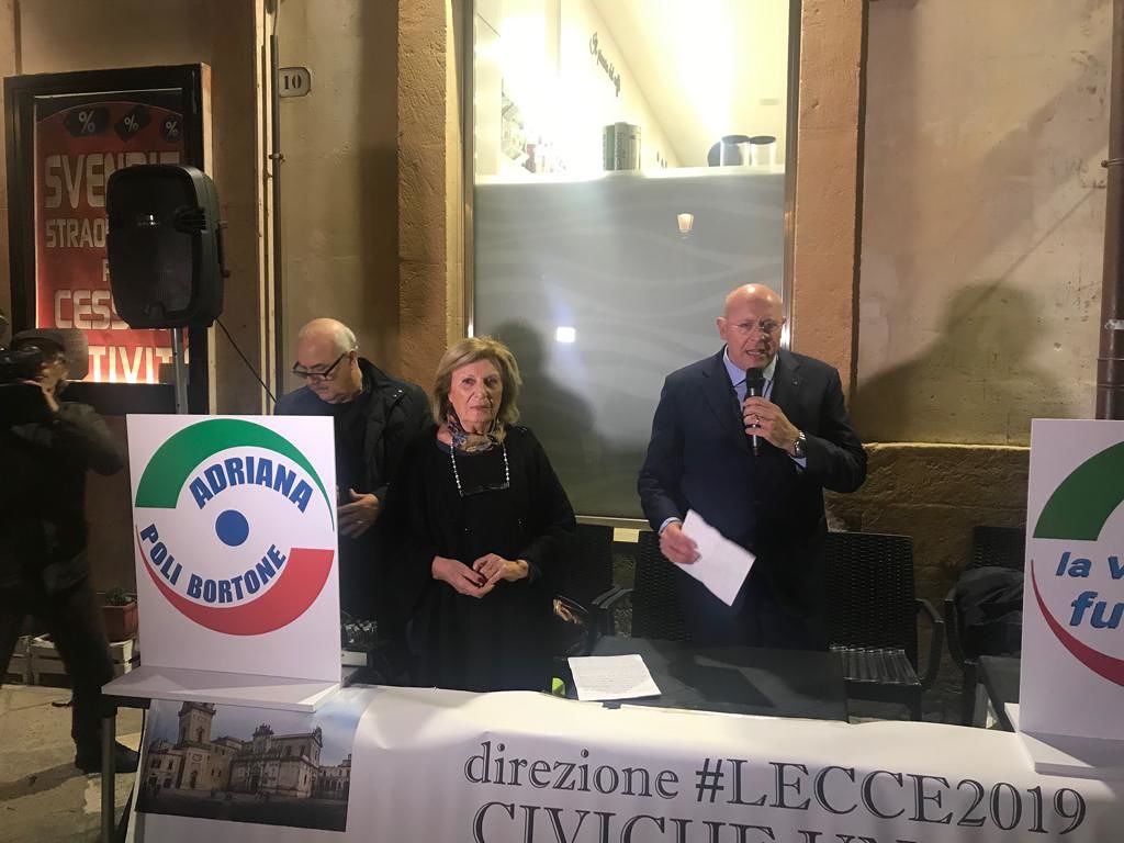 La lista di Adriana Poli Bortone si candida ad essere la locomotiva della costellazione civica a sostegno della senatrice che conta la partecipazione anche di MPL di Antonio Lamosa, Azzuro Popolare di Aldo Aloisi, Giovane Lecce guidata da Giovanni Gallo, la Fiamma Tricolore, Alleanza Salentina, Lega Per il Cittadino e per l’Ambiente di Ruggero Vantaggiaato e molti altri movimenti e associazioni.