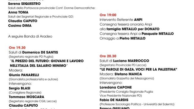 La Festa sarà inaugurata venerdì 12 settembre alle ore 18.30 con i saluti dei segretari e l’intervento dell’Anpi, in un momento di memoria dedicato alla famiglia Metallo. Subito dopo il testimone passerà ai Giovani Democratici, che apriranno il primo panel sul tema del lavoro e del salario minimo, portando la voce delle nuove generazioni al centro del dibattito politico. A seguire, l’attenzione si sposterà sulla Palestina con testimonianze e contributi di giornalisti, attivisti e studiosi, in un confronto che lega il locale al globale.