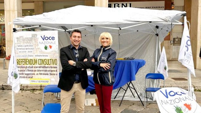 Fare sì che Voce Nazionale sia protagonista del cambiamento necessario a riportare Lecce alla naturale ribalta che le appartiene. È questa la richiesta di tanti leccesi che nel fine settimana appena trascorso, si sono recati presso il gazebo allestito in Piazza Sant’Oronzo, in occasione del referendum consuntivo sull’ampliamento degli scavi dell’Anfiteatro Romano, un momento di coinvolgimento della comunità organizzato dal movimento politico leccese, al quale hanno partecipato, tra gli altri, il Vicepresidente Mario Spagnolo e Serena Donnini Coordinatrice dei Comitati Territoriali di Lecce.