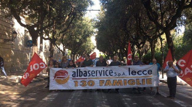 Ennesimo capitolo di una vertenza che, ad inizio estate, sembrava avesse trovato una soluzione. E invece, a quanto pare, i dipendenti della società Alba Service sono allo stremo. Ben sedici mensilità arretrate e, oltre questo, le dimissioni del Commissario Liquidatore hanno nuovamente fatto esplodere la protesta dei lavoratori, giunti stamattina in via XXV Luglio per bloccare – in segno di protesta -, uno dei tratti più trafficati del capoluogo salentino. A ridosso della Prefettura – dove peraltro è avvenuto un incontro -, gli operatori (assistiti dal sindacato COBAS) reggevano lo strioscione con scritto "Alba Service S.p.A. – 130 Famiglie". "Chiediamo immediatamente un incontro con Provincia di Lecce e Regione Puglia, perché la situazione sta diventando insostenibile", ci rivela Giuseppe Mancarella, segretario della Confederazione COBAS Lecce, contattato telefonicamente dalla redazione di LecceNews24.it