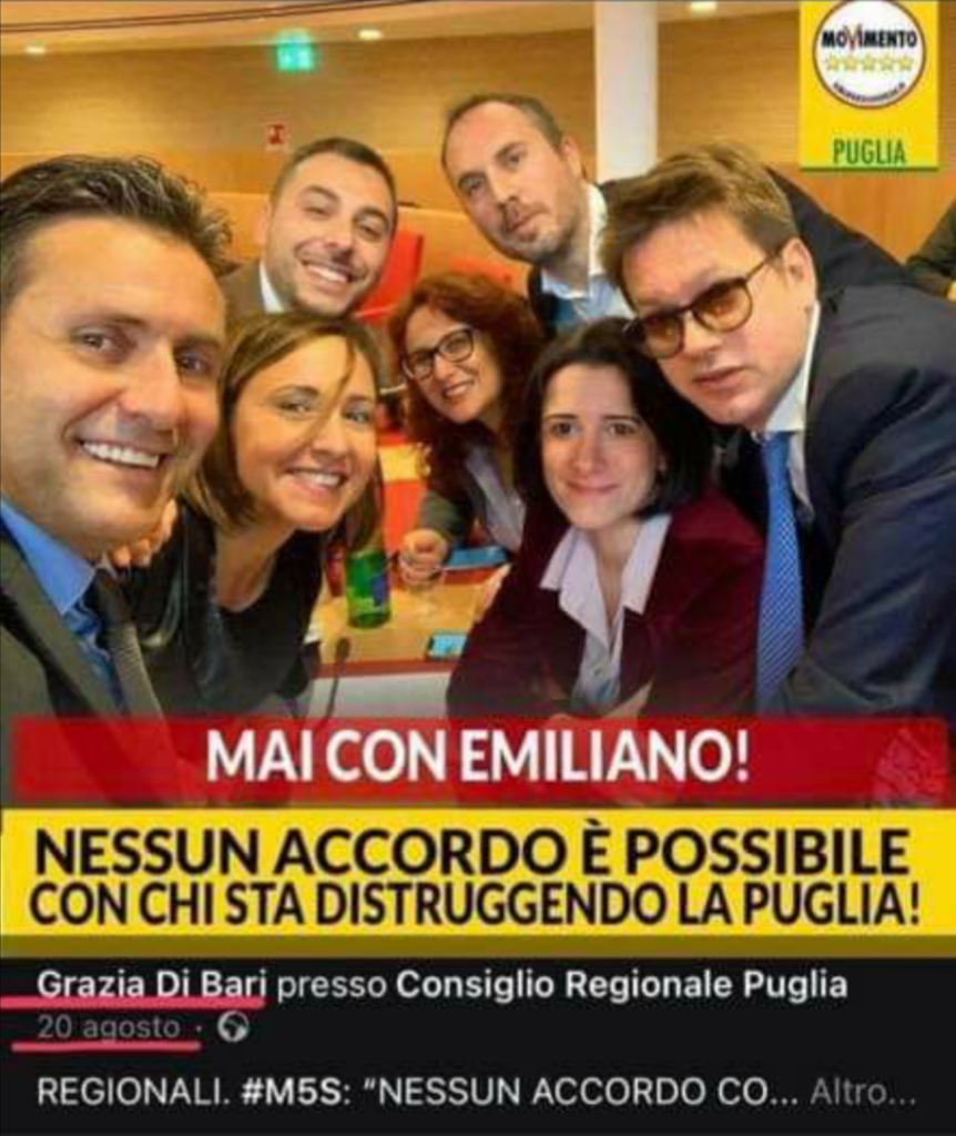 A suo sostegno, come dicevamo, è intervenuta immediatamente la senatrice Barbara Lezzi che non si capacita dell’accaduto, anzi non ci vuole credere: ‘Il M5S Puglia è entrato nella maggioranza di Emiliano. Tutti tranne Antonella Laricchia che ha deciso semplicemente di rispettare gli elettori che si sono già espressi e non dovrebbero essere né traditi né usati. I 4 consiglieri eletti al grido “Mai con Emiliano“, fervidi sostenitori dell’ “andiamo da soli altrimenti non ne entra di noi neanche uno“, hanno deciso, con capo politico e un ministro (così si dice), di aderire al programma di Emiliano, di avallare il suo sistema e, soprattutto, di ignorare quella consistente parte di attivisti ed eletti che non era e non sarà favorevole. Oggi, per questo accordo siglato lontani da tutti, Cristian Casili è stato eletto vice presidente del consiglio in quota maggioranza lasciando, peraltro, quella in quota minoranza a disposizione della destra. Si sprecheranno i già sentiti richiami alla responsabilità, al bene dei pugliesi e la famigerata azione che ci deve vedere “incidere da dentro”. Tutte chiacchiere in libertà perché il m5s, in Puglia, non ha alcun potere negoziale. Tutte chiacchiere buone per nascondere l’agire di chi ha scelto di vendere se stesso e di intraprendere l’opera d’assuefazione che, fino ad ora, ha visto come unica voce fuori dal coro il M5S. I 4 consiglieri andranno a sedere in giunta con un imputato e un’indagata scelti da Emiliano, quello più “grillino” di tutti come viene definito da giornaloni e giornalini’.