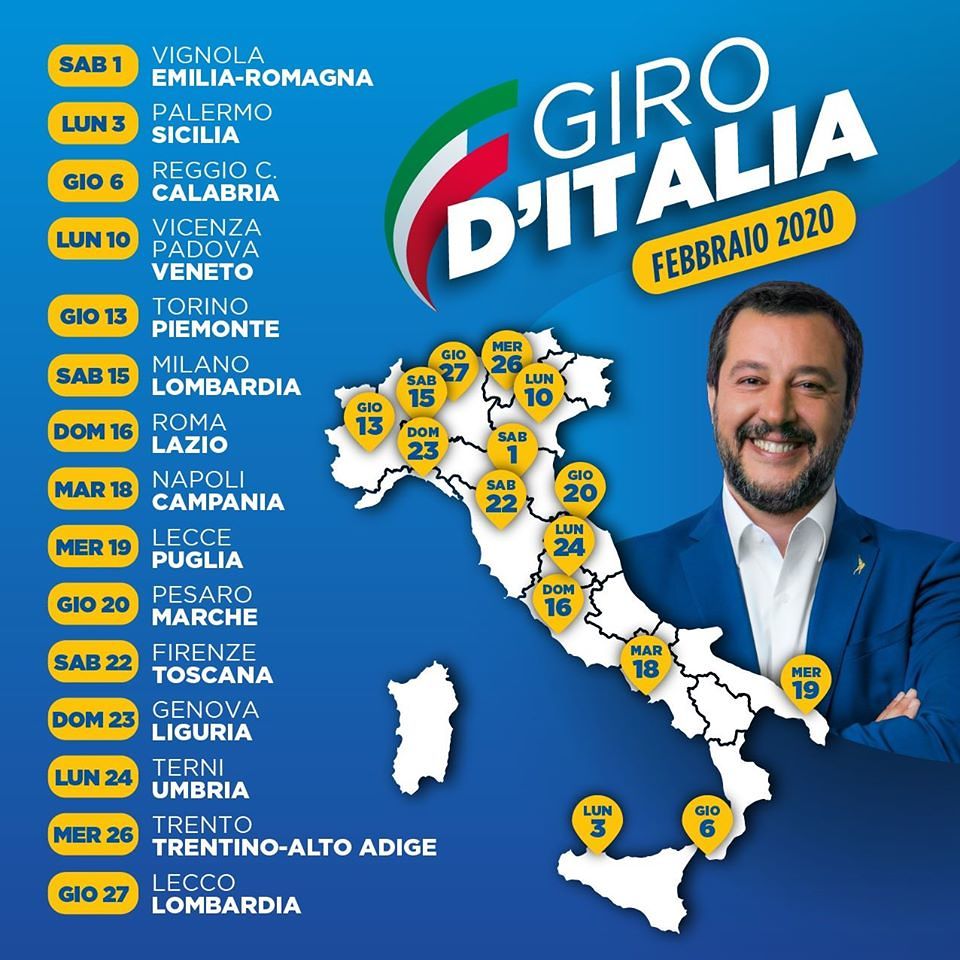 Archiviate le elezioni in Emilia Romagna e Calabria, Matteo Salvini ha ingranato di nuovo la marcia e ha ‘pensato’ ad un Giro d’Italia che toccherà anche le regioni che saranno chiamate alle urne in primavera. Ospite di Porta a Porta, il Leader del Carroccio aveva annunciato la sua presenta a Taranto, dove sarebbero sbarcati di lì a poco i migranti della Ocean Viking, ma nella versione ufficiale la tappa di del capoluogo ionico scompare e spunta quella di Lecce.
