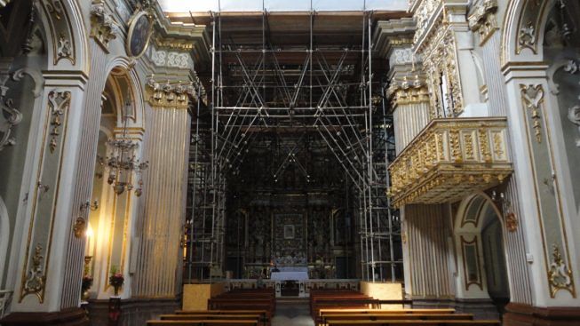 L’intervento di restauro ha interessato solo una parte del Santuario, che da molti anni era solo parzialmente agibile a causa della presenza di impalcature, montate per impedire la caduta di parti che minacciavano di staccarsi dalle coperture voltate e dalla cupola. Il MiBACT, con un finanziamento complessivo di 700mila euro, ha predisposto il progetto di restauro e diretto i lavori, eseguiti dall’Impresa Leopizzi 1750 di Parabita, che sono stati avviati a febbraio 2016 e oggi conclusi. I lavori hanno interessato l’affresco di S. Elena e S. Michele posto sopra l’arco trionfale, la cupola decorata da Mario Prayer e le superfici sottostanti dei pennacchi e degli archi, il transetto e tre cappelle che si affacciano sulla navata.