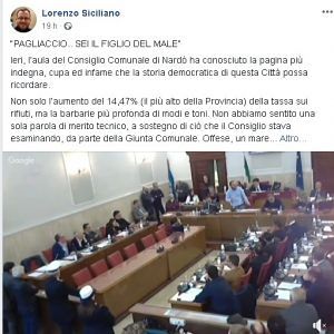 Su facebook lo sfogo amaro di Siciliano: “Ieri, l’aula del Consiglio Comunale di Nardò ha conosciuto la pagina più indegna, cupa ed infame che la storia democratica di questa Città possa ricordare. Non solo l’aumento del 14,47% (il più alto della Provincia) della tassa sui rifiuti, ma la barbarie più profonda di modi e toni. Non abbiamo sentito una sola parola di merito tecnico, a sostegno di ciò che il Consiglio stava esaminando, da parte della Giunta Comunale. Offese, un maremoto di offese gratuite, gravi, indecenti, che sono arrivate a scalfire nel profondo la mia onorabilità e quella della mia famiglia”.