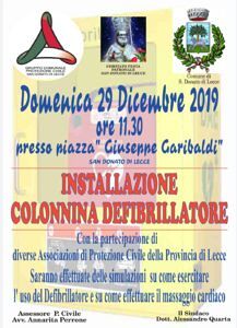 Domenica 29 dicembre, alle 11.30, a San Donato di Lecce, in piazza Giuseppe Garibaldi, ci sarà l’istallazione della colonnina del defibrillatore.
