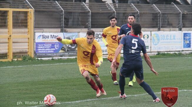 La curva delle emozioni conosce i primi sussulti sin dalle prime battute del secondo tempo. Il Toro va vicino al gol prima con Potenza che, liberato in area da Cancelli, conclude debolmente e poi con Granado che, al termine di un’azione ben costruita, colpisce di testa e per una questione di centimetri non beffa Cefariello. La partita entra nel vivo e alla mezz’ora gli ospiti restano in dieci per il doppio giallo comminato a Caponero, reo di due falli consecutivi ai danni di Mengoli. Il Nardò preme sull’acceleratore nel tentativo di sfruttare la superiorità numerica ma sono gli ospiti a passare clamorosamente in vantaggio: Galdean inventa un assist al bacio per Fanelli, l’imbucata al centro costringe Milli alla difficile deviazione, sul pallone si avventa Petruccetti che insacca. Danucci corre ai ripari e ridisegna i granata con una vocazione più offensiva. Il Toro si lancia a testa bassa alla ricerca del pari e riesce a rientrare in partita all’85’. Ci pensa Caputo con una magia su punizione a realizzare il suo ottavo centro stagionale e regalare il pareggio ai padroni di casa. L’assalto finale del Nardò si infrange sulla barriera lucana e la partita va in archivio con un pareggio che va stretto alla truppa di Danucci.