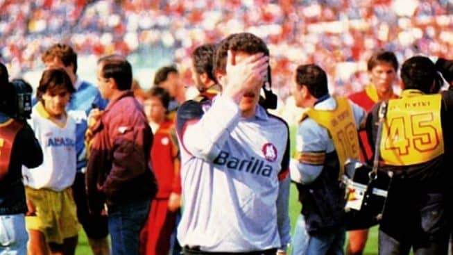 Era il primo campionato del Lecce in serie A, allenatore Fascetti, il Lecce retrocede ultimo in classifica con appena 16 punti. Alla penultima giornata con i salentini già retrocessi in serie B c’è la partita contro la Roma di Eriksson all’Olimpico, che dopo una rimonta incredibile raggiunge la Juve in testa alla classifica e crede di potersi giocare lo scudetto nelle ultime due partite. Ma non ha fatto i conti con il Lecce che dopo lo svantaggio ad opera di Ciccio Graziani pareggia con Albertino Di Chiara e si porta inaspettatamente in vantaggio con Beto Barbas su rigore.