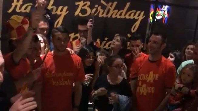 La squadra, terminato il giro d’onore, si è ritrovata a cena per festeggiare anche il compleanno del Presidente Sticchi Damiani: le 44 candeline sono state spente su un torta a forma di A interamente giallorossa.