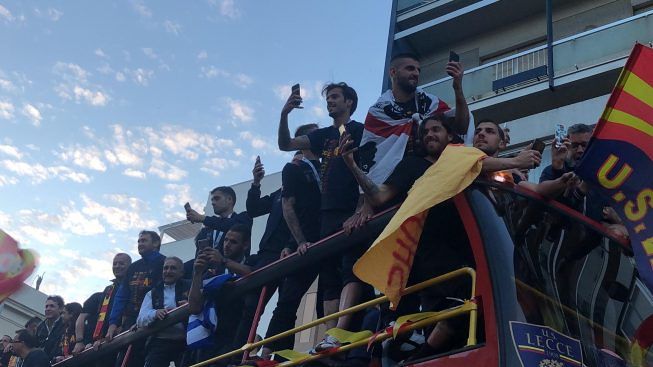 Una gioia che ha invaso e pervaso un intero popolo. E’ stato un sabato sera di gioia e di festa quello vissuto a Lecce: il ritorno in Serie A della squadra giallorossa dopo sette anni è stato festeggiato come meritava: fiumi di gente per le vie del centro, bolgia nell’ombelico di Piazza Sant’Oronzo, giocatori portati in trionfo.
