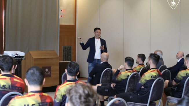 Alla presenza del presidente Saverio Sticchi Damiani, del direttore generale dell’area tecnica Pantaleo Corvino, del direttore generale Giuseppe Mercadante, dell’allenatore Eugenio Corini, dello staff tecnico e di tutti i calciatori della Prima Squadra, il consulente della Commissione Arbitrale Nazionale, Gianluca Rocchi, con il supporto di video e slide, ha chiarito tutti gli aspetti regolamentari sui casi più dubbi e di difficile interpretazione.
